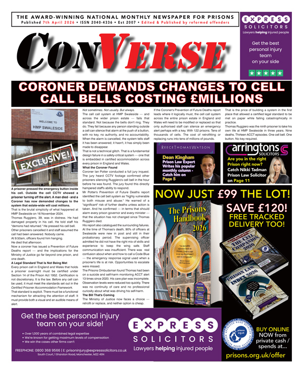 In this month’s 40 packed pages we lead with the millions of pounds it is likely to cost after a coroner demanded changes to the cell bell call system after a prisoner was found hanged and CCTV revealed he had pressed his cell bell for help – only for other prisoners to cancel the alert; a system defect the coroner says must be rectified. .… plus…